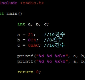 대부분의 프로그램은 데이터를 이용하는데, 데이터는 상수와 변수로 구분할 수 있다. 상수란 프로그램이 실행되는 동안 변하지 않는 고정적인 값이고, 변수란 프로그램이 실행되는 동안 값을 저장하는 일종의 공간으로 언제든지 변경될 수 있다. 상수 printf ("Hello World"); a = 3 ; 위와 같은 상황에서 우리는 "Hello World"와 숫자 "3"을 상수라 한다. 상수의 종류에는 다음과 같은 것들이 있다. 상수 예 정수 21, 034, 0xAC 실수 3.14, 0.7e3 문자 'A', 'C', 'f', 'z' 문자열 "Hello World", "안녕하세요" * 정수를 보면 034, 0xAC처럼 일반적인 숫자처럼 보이지 않는 정수들이 있다. 이런 정수는 8진수 16진수를 의미한다. 즉, 8진수..